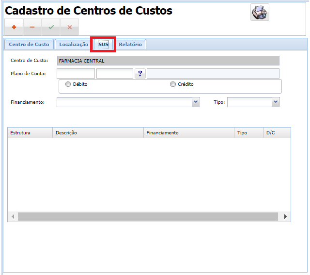 Para inserir um novo centro de custo, o usuário deverá clicar no botão (+) na parte superior da tela.