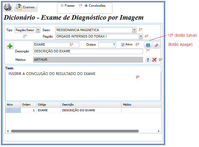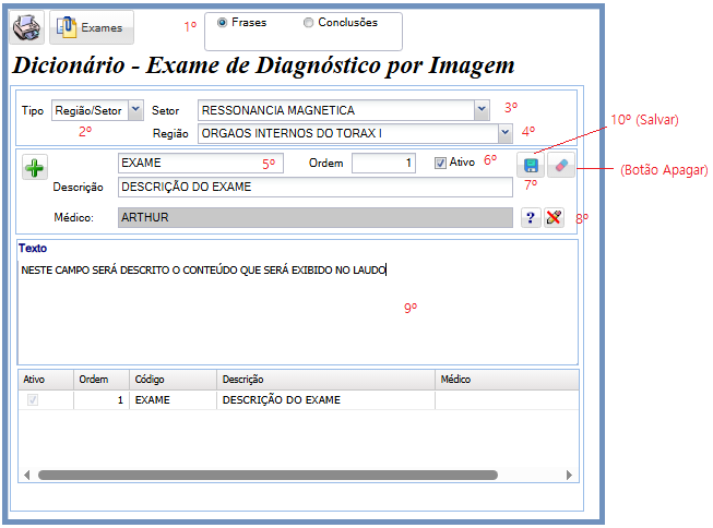 Botão Apagar: caso tenha feito o cadastro erroneamente, basta clicar neste botão para apagar. Observação: Só será apagado caso não haja nenhum laudo com este exame.