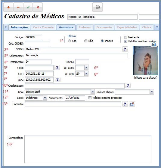 1º – Efetivo: O usuário deverá informar se o médico é efetivo ou não. Caso este médico futuramente seja desligado, poderá inativar o cadastro do mesmo.