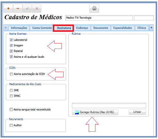 – No campo carregar Rubrica, o usuário poderá vincular a Rubrica do médico ao seu cadastro, ou seja, ao realizar uma evolução ou prescrição, a Rubrica do médico aparecerá na impressão juntamente com o CRM