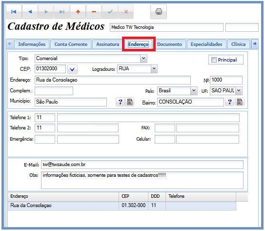 Nesta tela o usuário poderá inserir o endereço completo e contatos do médico cadastrado.