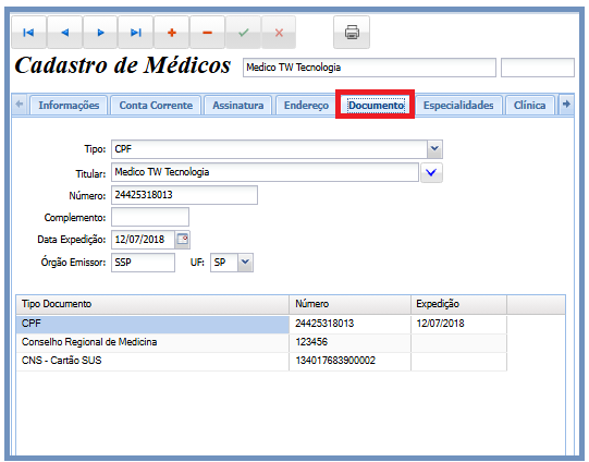 – Titular: Clicar no botão (V), o sistema automaticamente trás o nome do médico que está sendo cadastrado.