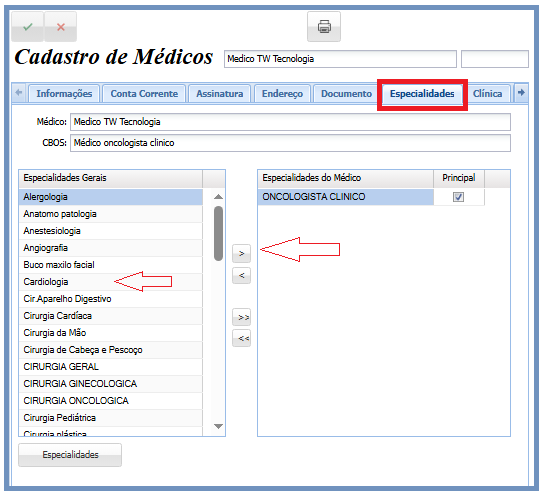 Nesta tela, o usuário deverá selecionar a especialidade do médico, em seguida clicar no botão (>) para vincular a especialidade ao médico cadastrado.