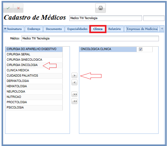 Nesta tela, o usuário deverá selecionar a Clínica do médico, em seguida clicar no botão (>) para vincular a Clínica ao médico cadastrado.