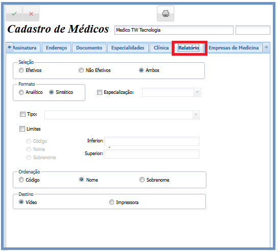 Nesta tela o usuário poderá através de seus filtros, emitir um relatório dos médicos cadastrados no sistema.