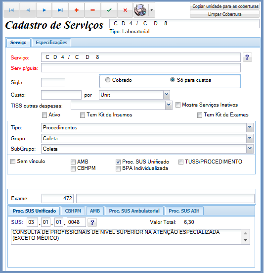 Caso o serviço seja um honorário ou um procedimento, ele poderá ser vinculado a tabelas do tipo amb 90, 92, 96, 99 (Digite o código do procedimento da tabela AMB no campo indicado).