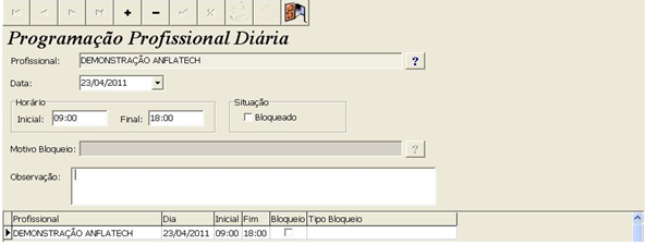 · No menu cadastro, na aba técnicos:– Nessa tela e feita a programação dos profissionais onde é definido os profissionais, os dias da semana e horário de trabalho. – Copiar a programação para os dias desejados – Copiar a mesma programação para vários profissionais Programação de Profissional Diária – Programação diária de profissional, onde é feita a programação de uma dia além daqueles que já existe na programação padrão ou seja programar um dia que não existe.Cadastro de Tipos de Bloqueio do Profissional– Nessa tela é feito o bloqueio por Profissional, ou seja onde é definido o tipo e o tempo que o profissional ficara bloqueado para realizar escala, passado esse tempo o mesmo poderá ser escalado normalmente.