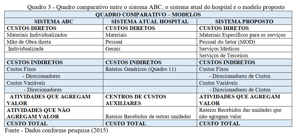 No Quadro 3 se apresenta a estrutura teórica do sistema ABC, a qual é classificada em custos diretos, indiretos, atividades que agregam valor e que não agregam. Neste contexto, os custos diretos são compostos pelos materiais e mão de obra, individualizados. No modelo atual utilizado pelo hospital, os custos diretos são divididos em: materiais, pessoal e custos gerais. Já nos indiretos se faz uso de rateios genéricos, não sendo divididos em custos fixos e variáveis, conforme preconizado pelo sistema ABC. Ainda dentro dos custos auxiliares são rateados nas demais unidades.
