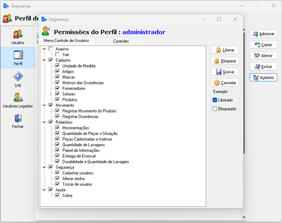 Ao acessar o sistema, o primeiro passo é ir em segurança, cadastrar usuários na aba perfil, cadastrando todos os setores que estarão envolvidos na movimentação de produtos. O cadastro desse setor também serve para cadastrar os acessos de cada usuário. Os acessos vão permitir a liberação dos menus conforme cada usuário.