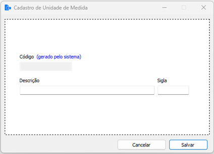 Digite a unidade a ser cadastrada, podendo ser peças, unidade, litros, entre outros. Depois de descrever e colocar a sigla, clique em salvar.