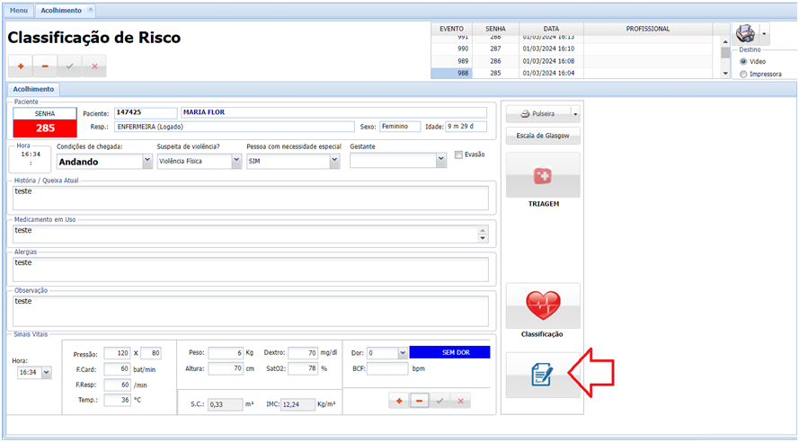 Para classificar o atendimento do paciente, é necessário clicar no botão conforme indica a figura abaixo: