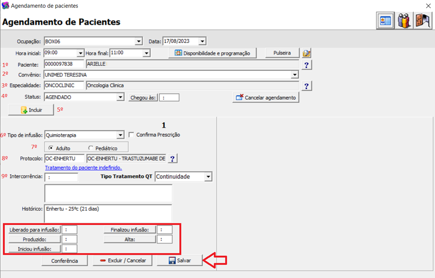 Na tela de conferência de Quimioterapia o usuário poderá conferir se as informações que estão nela conferem com os medicamentos que foram prescritos na prescrição de quimioterapia.