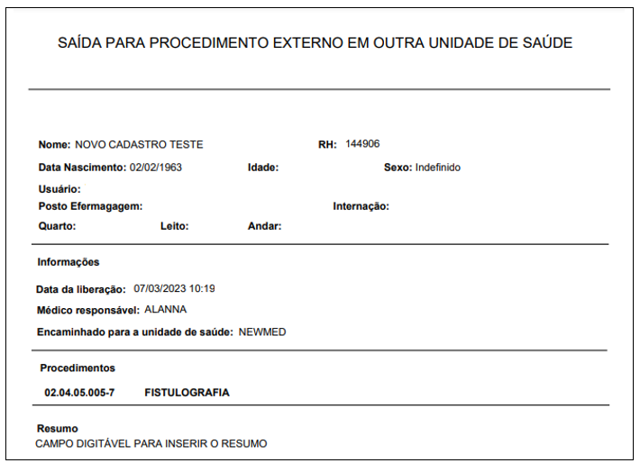Nesta tela, o usuário poderá gerar relatórios com todos os pacientes que tiveram saídas em um determinado dia ou por período. Basta selecionar os filtros desejados e clicar na impressora.
