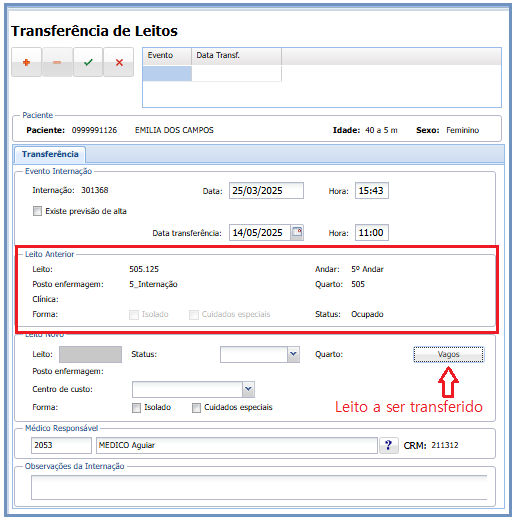 Ao abrir a tela de transferência de leito, o usuário poderá visualizar o leito que o paciente está internado, para transferir, basta clicar no botão “VAGOS”