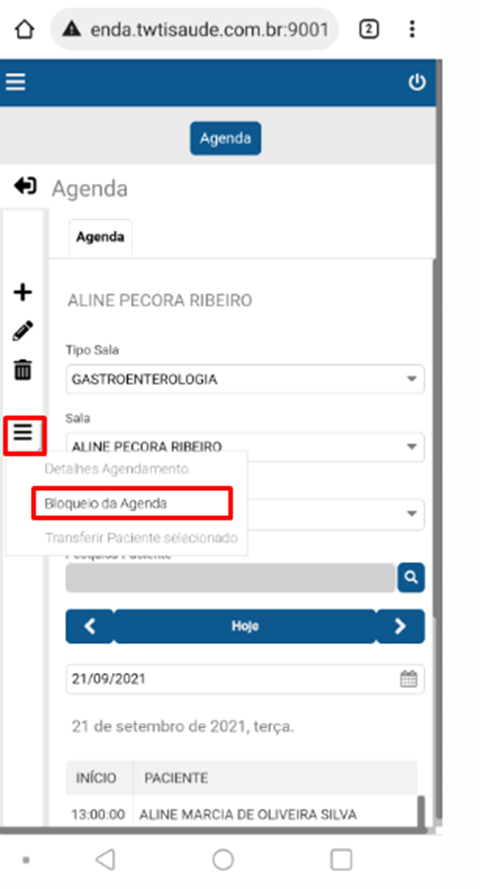 Para transferir um paciente já agendado o médico vai selecionar o horário do paciente agendado e clicar no menu lateral , o sistema irá abrir a tela de transferência e depois a confirmação da transferência.