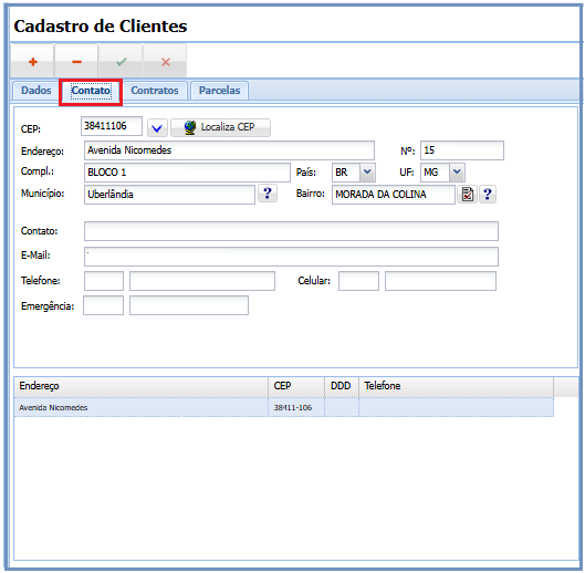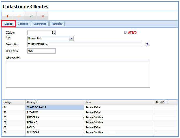 IMPORTANTE: Após o preenchimento do cadastro do cliente, o usuário deverá salvar as informações na parte superior da tela, botão ‘V’ na cor verde.