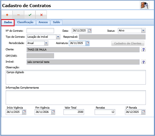 Ao acessar a Tela de Cadastro de Clientes, aba Dados, o usuário deverá preencher os campos abaixo: