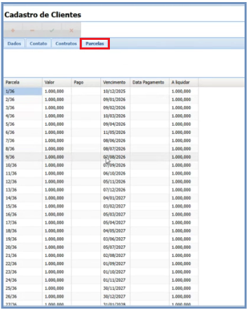 Depois de realizar o cadastro do cliente e definir a quantidade de parcelas dentro dos contratos, o sistema automaticamente gera as parcelas com data e valores conforme o exemplo abaixo.