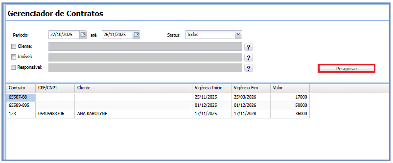 Nesta tela, o usuário poderá visualizar todos os contratos cadastrados.