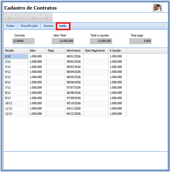 Nesta tela o usuário poderá visualizar a quantidade de parcelas e valores do contrato.