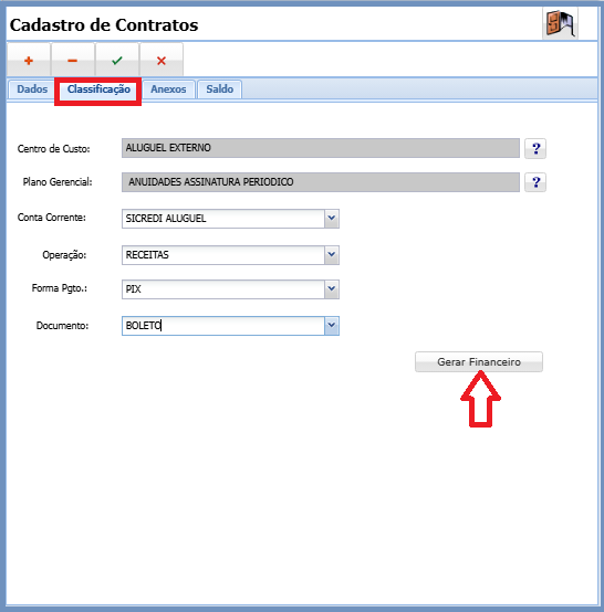 Ao preencher os campos acima, é necessário clicar no botão Gerar Financeiro. Ao gerar financeiro o sistema calcula a quantidade de parcelas e valor e atualiza a tela de Saldo.