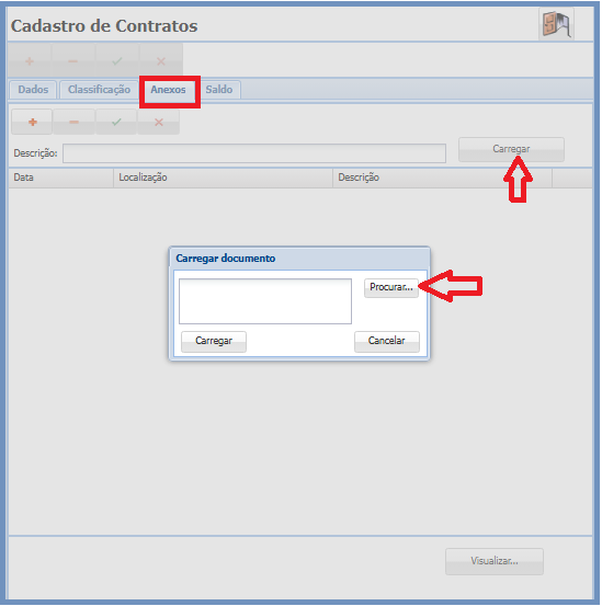 Nesta tela o usuário poderá anexar o contrato físico em forma de arquivo, basta clicar em carregar, em seguida Procurar, ao localizar o arquivo o usuário deverá clicar por fim em Carregar novamente, conforme indica a figura abaixo.