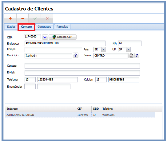 Nesta tela, o usuário poderá inserir informações do contato do cliente que está sendo cadastrado.