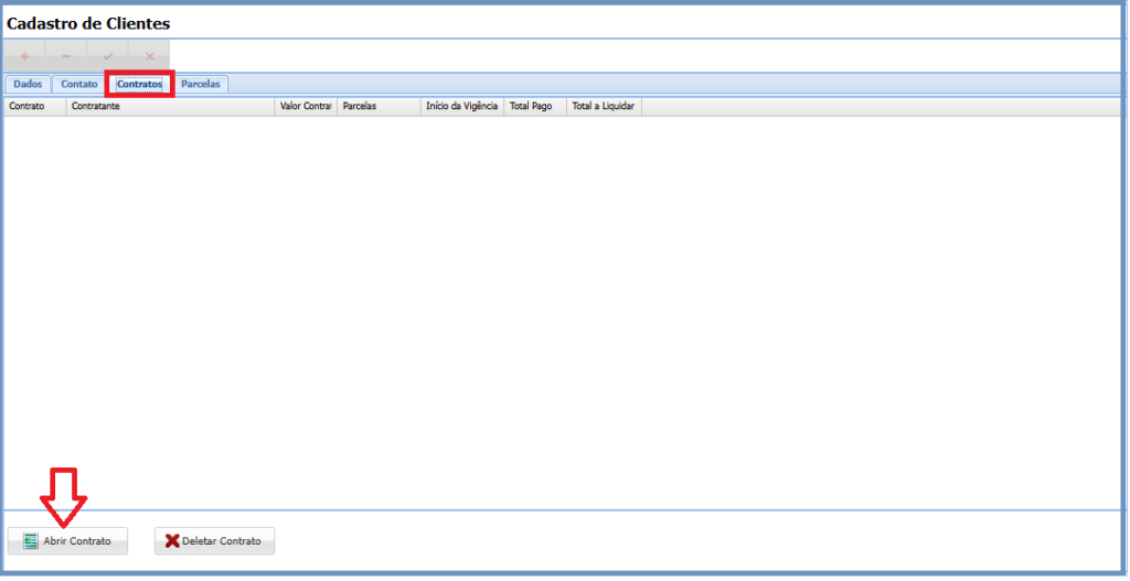 Basta clicar no botão Abrir Contrato na parte inferior da tela conforme indicado abaixo.